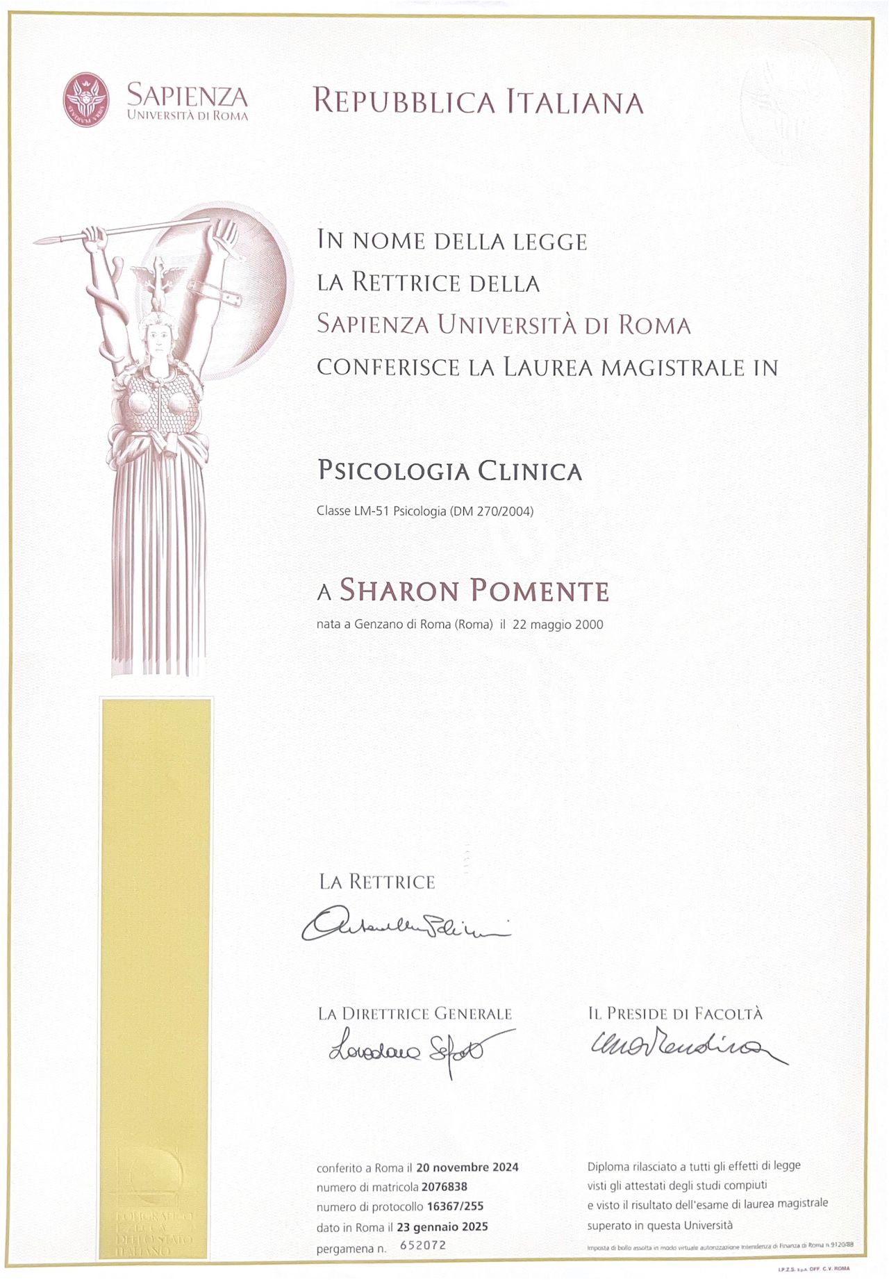 Sono Sharon, psicologa clinica laureata presso l’Università La Sapienza di Roma.